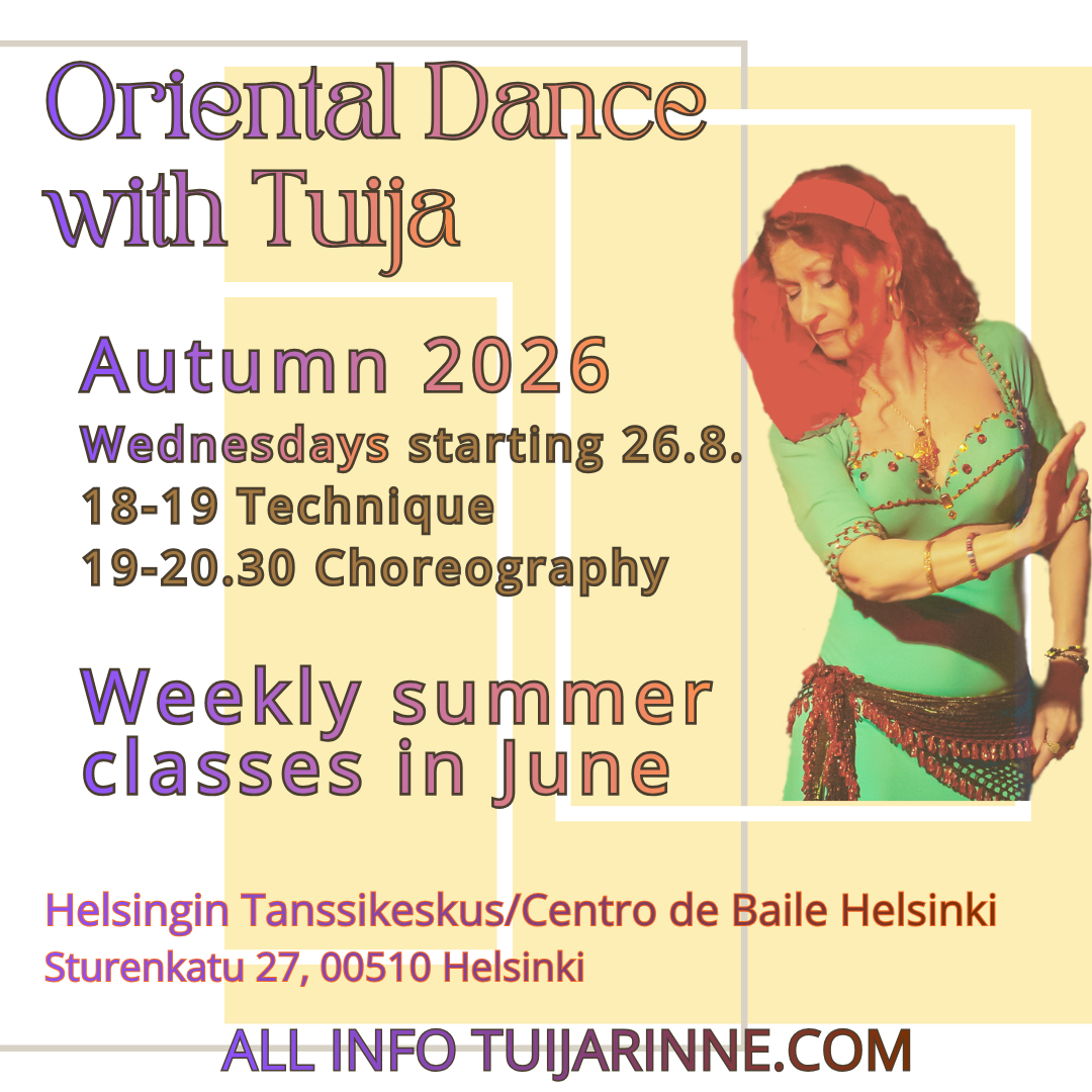 To all who have learnt at least the basics of Oriental dance and who want to deepen and polish their own dance. A lot to work with also to the more advanced students, to performers and teachers. To topics will be tailored and differentiated so that everyone gets plenty of material to develop their own dance.